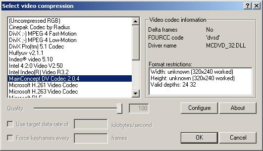 Se lanseaza VirtualDub (VirtualDub.exe din directorul unde ai dezipat kitul) apoi din meniu File->Open Video File alegi fisierul video obtinut cu Ulead Video Editor sau alte programe de video editing (ATENTIE din nou: trebuie sa fie format DV type 2 vezi mai sus ce e scris in rosu). Acum se trece la alegerea codecului: la Video-> Compresion se alege codecul MainConcept DV codec