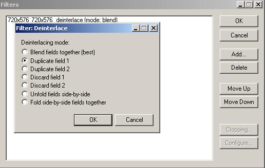 Apoi se adauga filtrul de deintretesere: Video->Filters -> Add ->deinterlace (internal) -> Duplicate field 1