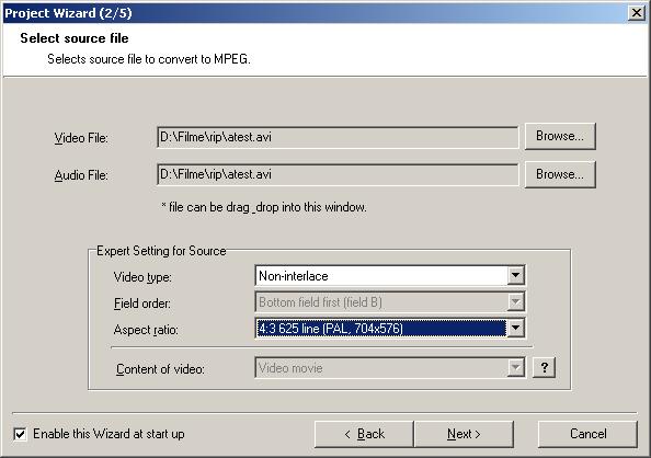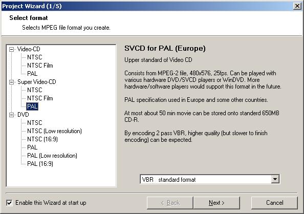 Avand wizardul deschis (File->Project Wizard) alegem Super Video-CD -> PAL cu VBR: