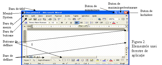 Ferestrele de aplicatie corespund unei aplicatii in curs de executie. Elementele unei ferestre de aplicatie sunt prezentate in figura urmatoare.