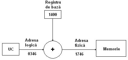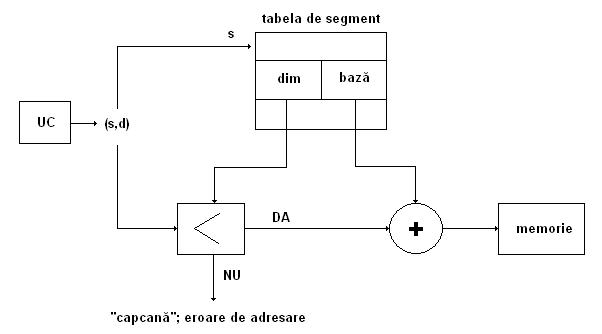 0<d<dim, sistemul de operare va fi sesizat printr-o "capcana" cu semnificatia "incercare de adresare in afara segmentului". Daca insa deplasare se incadreaza intre limitele permise, valoarea ei se adauga la valoarea adresei de baza a segmentului, formandu-se astfel adresa din memoria fizica a cuvantului dorit ( se poate afirma deci, prin analogie, ca tabela de