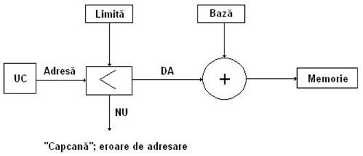 Deoarece in memorie pot exista in acelasi timp mai multe programe, trebuie prevazute si mecanisme de protectie. Pentru fiecare partitie se pot folosi cite doi registri limita ( va fi necesara o relocare statica in momentul asamblarii sau al incarcarii) sau cate o pereche registru baza - registru limita ( solutia permite alocarea dinamica in momentul executiei ); registrul de baza contine valoarea celei mai mici adrese fizice, in timp ce registrul limita contine valoarea domeniului de adrese logice ( Figura 15 ).