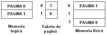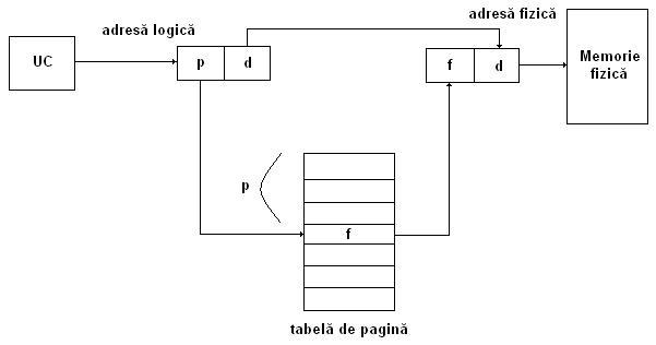 Se considera ca memoria fizica ( atat cea interna cat si cea auxiliara ) este separata in blocuri de marime fixa numite cadre. Memoria logica este impartita in blocuri de aceeasi dimensiune numite pagini. Atunci cand se doreste lansarea in executie a unui program se transfera paginile sale din memoria auxiliara ( de obicei un disc magnetic cu acces rapid ) in oricare dintre cadrele disponibile ale memoriei interne. Fiecare dintre adresele generate de catre UC este formata prin alipirea a doua informatii: numnarul paginii ( p ) si deplasarea in pagina ( d ). Numarul paginii este utilizat ca index intr-o tabela de pagina care contine adresele de baza ale cadrelor asociate paginilor programului respectiv. Adresa de baza impreuna cu deplasarea in pagina definesc adresa fizica de memorie ce corespunde adresei logice generate de UC. Figurile 17 si 18 ilustreaza suportul hardware si respectiv modelul de memorie cu paginare ( paginarea memoriei logice si fizice ).