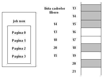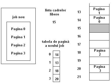 utilizator este necesar un cadru in memoria interna. In urma alocarii realizate de catre planificator, paginile se incarca pe rand in cadrele alocate, al caror numar va fi memorat in tabela de pagina al job-ului ( Figura 19-a - alocarea cadrelor libere inainte si Figura 19-b - alocarea cadrelor libere dupa ). Tabela de pagina asociata fiecarui job se pastreaza alaturi