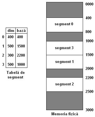 ). Pentru fiecare dintre acestea , tabela de segment contine cate o intrare separata, in care se pastreaza adresa de inceput a segmentului in memoria fizica ( baza ) si dimensiunea segmentului ( dim ). Astfel, deoarece segmentul 1 incepe la locatia 1500 si are dimensiunea