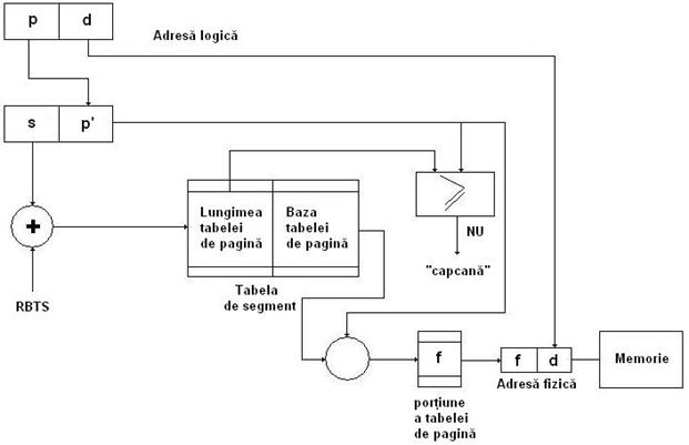 se combina cu deplasarea in pagina si formeaza adresa fizica. Deoarece ultima pagina a fiecarui segment nu este intotdeauna complet ocupata, metoda introduce totusi o cantitate redusa de fragmentare externa ( in realitate, atunci cand se lucreaza cu tabele de segment de dimensiuni mari, mecanismul este ceva mai complicat ).