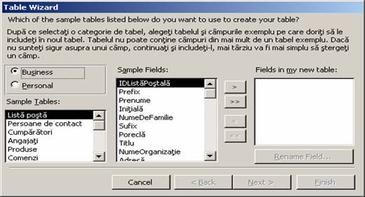 Daca alegerea nu corespunde necesitatilor dorite, se foloseste butonul de renuntare, dupa selectarea campului respectiv din fereastra Fields in my new table.
