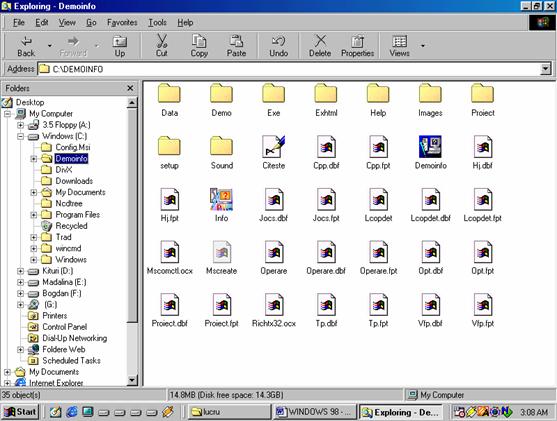 OBSERVATIE : De retinut, ca panoul din stanga cuprinde dosare care, pe langa nume, pot fi marcate cu semnul "+", ceea ce indica faptul ca ele contin o structura de tip arborescent si putem vizualiza continutul acestora in fereastra din dreapta ecranului EXPLORER, sau cu semnul "-", ceea ce indica faptul ca ele sunt parte dintr-o structura de tipul amintit mai sus si se pot "restrange" catre nivelul superior.