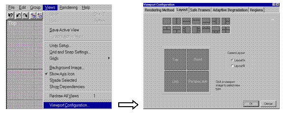 Acelasi efect se obtine cu mouse-ul : clic cu butonul din dreapta intr-o fereastra care apare in Layout, sau clic cu acelasi buton pe titlul unei vederi (viewport) din spatiul de lucru. In ambele cazuri apare un meniu derulant si se selecteaza configuratia dorita.