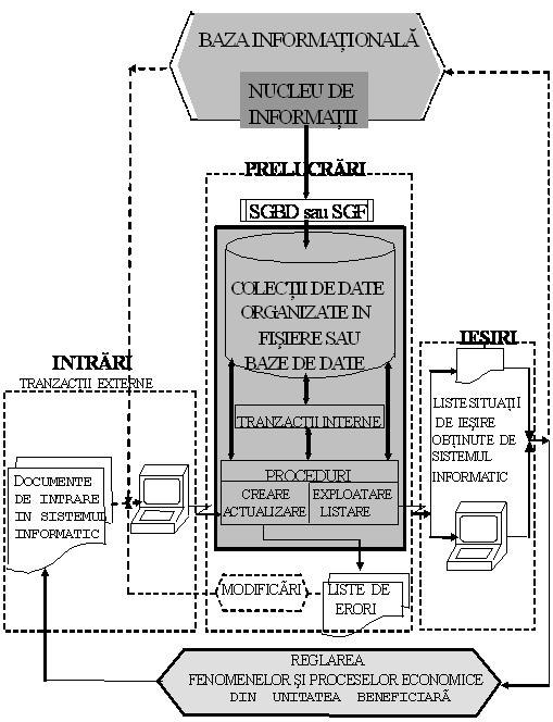In sectiunea 2 s-a specificat ca sistemele informatice sunt structurate pe subsisteme, aplicatii, unitati functionale, unitati de prelucrare sau proceduri si module program. Merita remarcat ca, indiferent de nivelul sau, orice componenta a sistemului informatic presupune intrari, prelucrari si iesiri, iar relatiile dintre componente se realizeaza prin intermediul unei baze informatio-nale, care exista si in sistemul informational, dar in conditiile informatizarii, va fi reflectata in colectii omogene de date ce pot fi organizate in baze de fisiere sau date in functie de sistemul specific de gestiune a datelor (SGF sau SGBD).