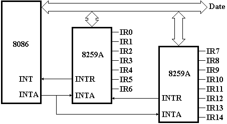 Intreruperile hardware dezactivabile sunt controlate de unul sau mai multe circuite specializate (controlere de intreruperi 8259A), care accepta fiecare cel mult opt cereri de intreruperi, pe care le transmit catre linia INT a procesorului. Daca bistabilul IF este 1, procesorul raspunde printr-o secventa de semnale electrice INTA (Interrupt Acknowledge), asemanatoare unei secvente de citire a codului unei instructiuni. Pe durata unuia din aceste semnale, controlerul care a initiat cererea de intrerupere plaseaza pe magistrala de date octetul care identifica nivelul intreruperii. Un asemenea sistem se numeste sistem vectorizat de intreruperi (vezi Figura 2.8).