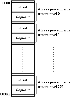 Intr-un sistem cu procesor 8086, pot exista maxim 256 de intreruperi (nivele) distincte. Fiecare din aceste nivele poate avea asociata o procedura de tip far, numita rutina de tratare. Adresele acestor rutine sunt trecute intr-o asa numita tabela de intreruperi, aflata la adresele fizice 00000 - 003FFH, ocupand deci 1024 de octeti. Fiecare nivel ocupa 4 octeti, primii reprezentand offset-ul, iar urmatorii adresa de segment a procedurii (vezi Figura 2.9).