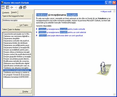 Se afiseaza o fereastra de Ajutor Outlook care explica cum se trimit si se primesc mesajele.
