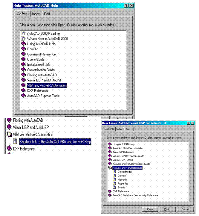 Pentru a ajunge la Help VB din AutoCAD se deschide Help AutoCAD (de ex. Tasta F1 cu Aplicatia AutoCAD activa)