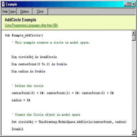 iar pentru majoritatea metodelor exista exemple asa ca prin click pe Example se deschide o fereastra cu exemplu de adaugare a unui cerc in spatiul Model.