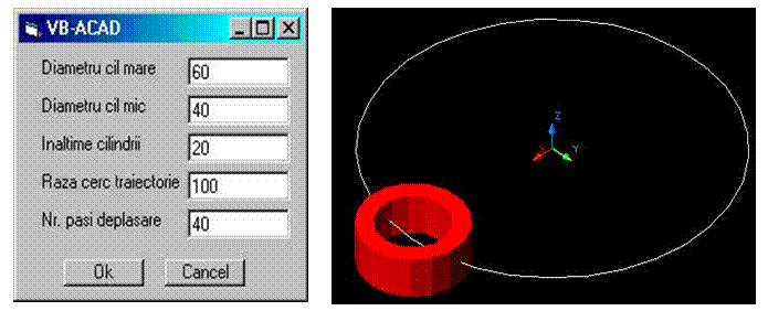 Proiectul va avea o forma in care se specifica date pentru obiectul care se genereaza si pentru deplasarea acestuia. Se vor crea 2 cilindrii concentrici cu inaltime egala cu centrul cercului de baza in origine ca model solid, apoi unul va fi extras din celalalt. Dupa generarea obiectului acesta va fi rotit pe o traiectorie circulara, incrementul de deplasare fiind specificat de utilizator intr-o caseta de dialog (forma VB).