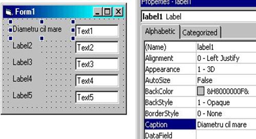 Din cerintele aplicatiei se observa ca este necesar ca utilizatorul sa precizeze date pentru diametrul cilindrului mare si a celui mic, inaltimea cilindrilor, raza cercului care reprezinta traiectoria si numarul de pasi (de cate ori se va deplasa obiectul pana la parcurgerea circumferintei cercului pentru a da impresia unei deplasari continue). Deci am nevoie de 5 textBox-uri unde utilizatorul va da valorile si 5 etichete pentru specificarea semnificatiei parametrilor. Adaug controalele necesare pe forma: