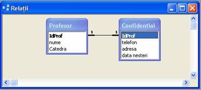 Astfel,pentru a detalia cele de mai sus,vom spune ca intre doua tabele exista o relatie de tipul tipul 1:1 (one-to-one) daca ,pentru fiecare linie din prima tabela exista cel mult o linie in cea de-a doua. In Access ,relatiile de tip 1:1 pot fi utile atunci cand doriti sa impartiti o tabela in doua sau mai multe tabele pentru motive de securitate, performanta sau datorita limitei de 255 de coloane pentru o tabela impusa de Access. De exemplu, puteti crea o tabela care sa contina informatii confidentiale despre profesori, cum ar fi adresa , telefonul, data nasterii etc., la care accesul sa fie limitat. Astfel, cheia primara a celor doua tabele este si cea care face legatura intre ele.