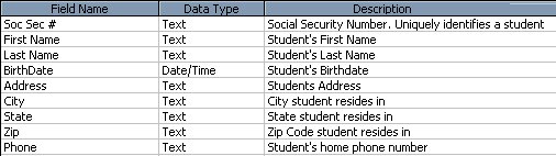 Fiecare camp dintr-o inregistrare contine acelasi tip de informatie (de exemplu numele de familie al unui student)Apasati tasta F11 pentru revenire in fereastra Database.