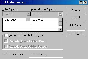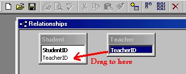 O relatie functioneaza pe baza unor campuri comune ale tabelelor. In majoritatea cazurilor, aceste campuri comune sunt: cheia primara a unui tabel (primary key care furnizeaza o identificare unica a fiecarei inregistrari din tabelul respectiv) si cheia externa (foreign key) a altui tabel. De exemplu profesorii (teachers) pot fi asociati cu studentii (students) pe care ii au in responsabilitatea lor, prin crearea unei relatii intre tabelele teacher si student pe baza campului TeacherID. Se urmeaza pasii de mai jos pentru crearea relatiei intre cele doua tabele: