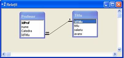 Cate titluri poate avea un profesor?Cel mult unul. Cati profesori au acelasi titlu? Mai multi. Astfel,relatia ,,Profesor are titlu este de tipul 1:m ( one-to many).
