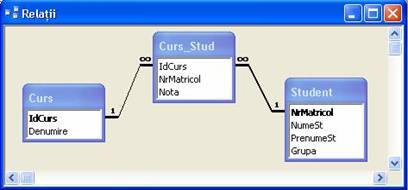 Doua tabele se afla intr-o relatie de tip m:m (many-to-many) daca pentru fiecare linie din prima tabela pot exista mai multe linii in cea de-a doua si, totodata, pentru fiecare linie din cea de-a doua tabela pot exista mai multe linii in prima. Relatiile de acest tip nu pot fi modelate direct in Access, astfel incat ele trebuie sa fie impartite in mai multe relatii de tip 1:m. De exemplu, un student se poate inscrie la mai multe cursuri optionale,iar la un curs pot participa mai multi studenti. Pentru a modela aceasta relatie vom crea o tabela de legatura, numita Curs_Student, care va contine cate o linie pentru fiecare pereche student-curs existenta. Astfel, relatia de tip m:m este impartita in doua relatii de tip 1:m, una intre tabelele Student si Curs_Student si cealalta intre tabelele Curs si Curs_Student.(figura I.3)