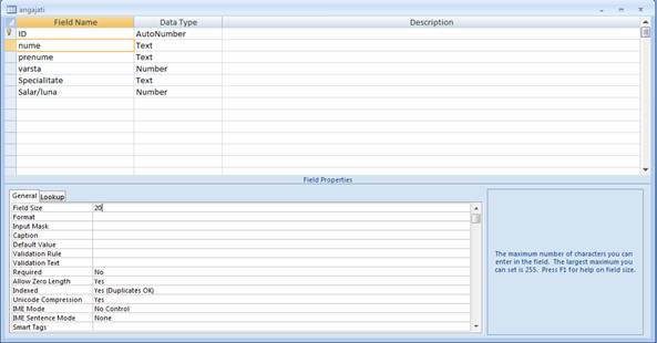 Introduceti urmatoarele date pentru a defini campurile tabelului: