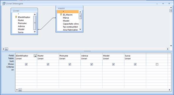 Am folosit 6 campuri din 2 tabele. Putem filtra datele obtinute prin completarea campului 'Criterii' cu o informatie din campul respective.