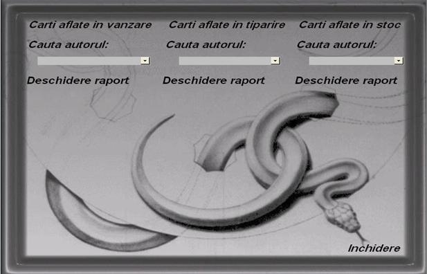 La deschidere va aparea pe ecran un formular care va deschide automat un altul conducand catre tabela principala numita"Carti".Aceasta are unite toate formularele si interogarile pentru a facilita utilizarea programului.Accesand oricare din aceste butoane putem deschide formularul sau interogarea dorita, sau se poate opri aplicatia.