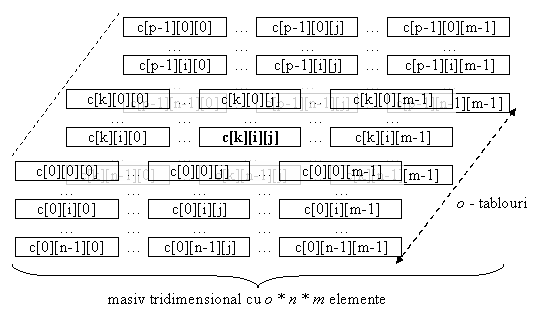Figura 3 descrie tipul de masiv tridimensional, in care c[k][i][j] reprezinta elementul de pe linia i si coloana j din tabloul k al masivului tridimensional c.