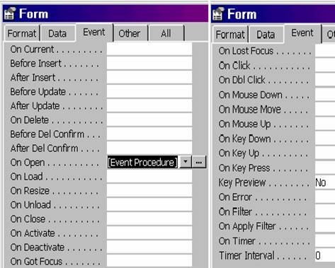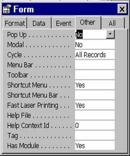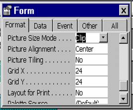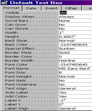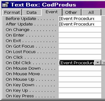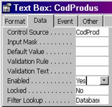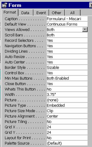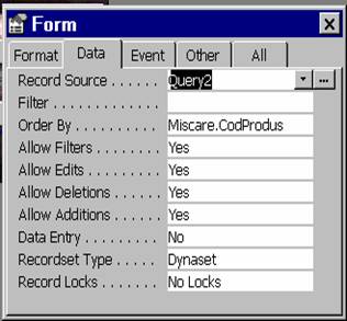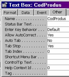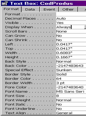 Observatie. În general, controalele, au în aceasta pagina proprietatea Name, care atribuie un nume obiectului. Formularele si rapoartele au numele afisat în fereastra Data Bases, acesta fiind cel ce se va folosi atunci când se vor face referiri la aceste obiecte.