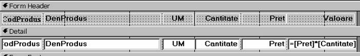 În sectia detail, avem un control calculat pentru valoare, care va folosi datele din înregistrarea respectiva. El va avea în Control Source: