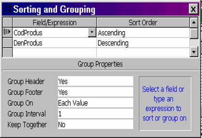 Observatie. Proprietatile Order, sunt în general nu se folosite, sortarea activându-se prin comanda prezentata anterior, Sorting and Grouping.