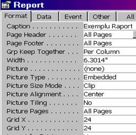 Caption Titlul raportului. Apare în bara de titlu a acestuia. Nu trebuie confundat cu numele raportului. Implicit, daca proprietatea nu este completata, numele formularului se va folosi si ca titlu. De asemenea nu trebuie confundat cu adevaratul titlu care se afiseaza pe raport în sectiunea Header Report.