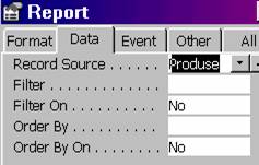 Proprietatea cea mai importanta a raportului. Record Source, stabileste obiectul (tabela, cerere) de care e legat raportul.