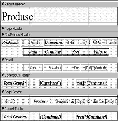 Page Header, fiind fara dimensiune, este anulata, controalele Label, folosite în capul de tabel fiind plasate în sectiunea Group Header.