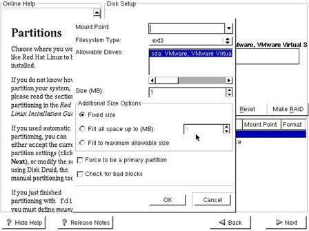 Aveti nevoie de o partitie / (root) pentru a stoca kernelul si fisierele legate de acesta. Aceasta partitie nu trebuie sa fie foarte mare. Insa, daca dispuneti de spatiu, incercati sa o faceti de 512 MB sau mai mult. (In conditiile in care creati si alte partitii este de ajuns ca partitia / (root) sa aiba 256 MB). Asigurati-va ca ati ales pentru aceasta partitie tipul Linux native (sau ext2/ext3, in functie de versiunea de Red Hat pe care o instalati).