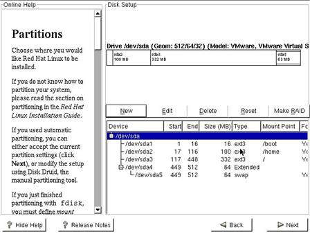Red Hat va permite sa va partitionati fiecare disc, unde fiecare partitie este notata utilizand o schema de genul hd[a-z][N] pentru discurile hard IDE si o schema sd[a-z][N] pentru discurile hard SCSI. Aici N este numarul partitiei. De exemplu, hda 1 este partitia numarul 1 de pe primul disc IDE, hda, si, similar, sda 1 este prima partitie de pe primul disc SCSI. Va trebui sa va decideti singuri cum va veti partitiona discurile. In continuare sunt prezentate cateva sfaturi.