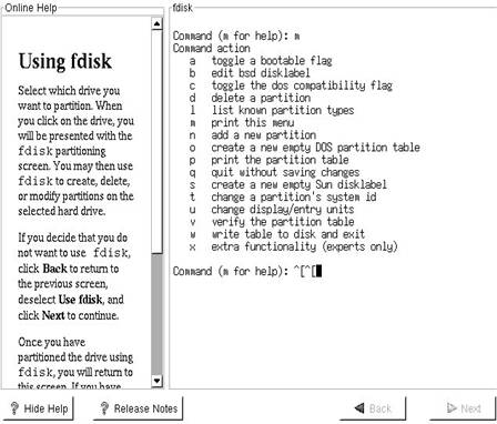 Aceasta comanda va comunica programului ca doriti sa lucrati cu partitiile primului disc IDE. Asa cum o arata si FIG 2.5 fdisk afiseaza un prompt “Command (m for help):” unde puteti introduce litera m pentru a obtine un ecran help (de ajutor) (FIG 2.5).