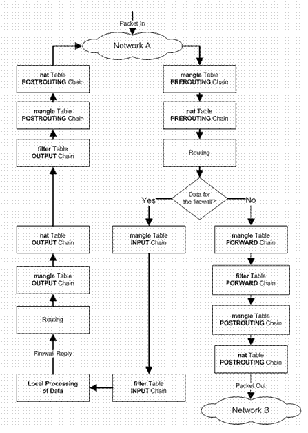 To help make this clearer, take a look at the way packets are handled by iptables. In Figure 14.1 a TCP packet from the Internet arrives at the firewall's interface on Network A to create a data connection.