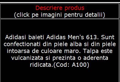 In sectiunea Descriere produs am prezentat informatii generale despre materiale si design pentru fiecare produs in parte. Pe langa aceste informatii, la sfarsit, se regaseste in paranteze codul de comanda a produsului respectiv. Am conceput aceasta sectiune pentru ca persoanele care cumpara produse de pe site sa aiba o imagine completa a produsului si sa fie siguri de ceea ce cumpara, fara sa aiba nici un fel de dubiu.