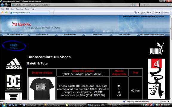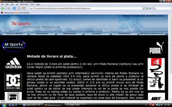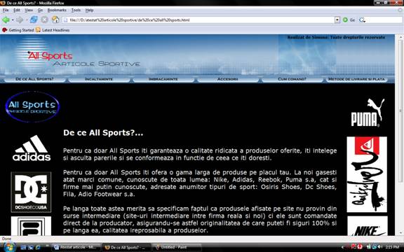 Site-ul realizat a fost conceput cu scopul de a oferi o imagine cat mai fidela a modalitatii de achizitie online a articolelor sportive. Am incercat sa realizez un site pe care vizitatorii pot gasi cateva din cele mai reprezentative marci care creaza si distribuie articole sport, pornind de la imbracaminte, incaltaminte si diverse accesorii.