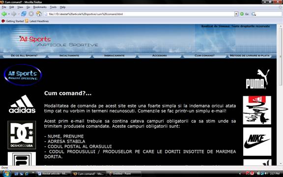 Pentru un plus de design si pentru a nu lasa paginile "goale" am hotarat sa inserez cateva bannere ale brand-urilor recunoscute in ceea ce priveste articolele sportive. Particularitatea acestor bannere este aceea ca atunci cand cel care navigheaza executa click pe oricare din acele bannere, va fi automat redirectat la pagina proprie a brand-ului respectiv.