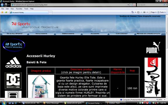 In continuare voi prezenta paginile din cadrul meniurilor principale: Incaltaminte, Imbracaminte si Accesorii. In cadrul acestor pagini structura de baza este aceeasi cu a celorlalte pagini, doar ca produsele expuse sunt asezate intr-un tabel pentru a fi mai usor de urmarit de catre persoana care navigheaza pe site. Tabelul este format din 4 coloane care cuprind urmatoarele categorii: