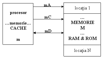Comunicatia procesorului cu memoria externa M se face prin grupuri de linii de legatura numite magistrale. De exemplu pentru transmisia paralela (simultana), de la procesor la memorie, a celor 16 biti de adresa se foloseste o magistrala de adrese care are 16 linii, ca in figura urmatoare. Aceste linii formeaza magistrala de adrese (mA) pe care sunt transmise catre memorie coduri sau 'cuvinte' cu 16 ranguri: A15, A14, A13, A12, , A3, A2, A1, A0.