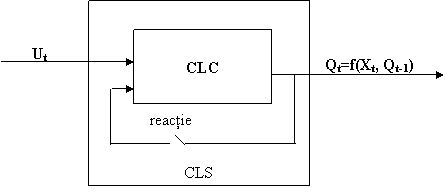 Circuitul logic secvential (CLS) se obtine dintr-un CLC prevazut cu cel putin un circuit de reactie. Prin reactie se intelege o conexiune (circuit) prin care semnalul de iesire este aplicat la una din intrari. In aceste conditii, iesirea Qt va depinde nu numai de intrare ci si de valoarea iesirii la momentul precedent, ca in figura urmatoare in care facand Xt=Qt-1 rezulta Qt=f(Ut, Qt-1), in care f este functia logica a CLC-ului cu care s-a realizat CLS-ul.