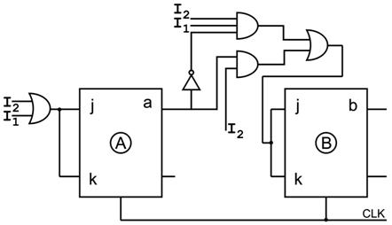 Din cele de mai sus rezulta ca CLS-ul care implementeaza ecuatia de stare a RS-lui se poate construi in jurul unui RS la care se adauga nonAND pentru formarea lui R=KQt-1 respectiv a lui S=J(~Qt-1) prin introducerea a 2 reactii suplimentare una dupa Q si alta dupa ~Q, ca in urmatoarea schema logica a JK-lui.