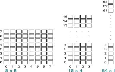 In echipamentele numerice informatia este organizata fizic si logic. Prin organizare fizica se intelege modul de stocare propriu memoriei semiconductoare, iar prin organizare logica - modul de organizare a informatiei in echipament. Cele doua marimi nu sunt neaparat egale. Exista memorii integrate cu organizare multipla de obicei pe 8 sau 16 biti (memoria din figura 1 are o capacitate de 64 de biti si se poate organiza in 64 de cuvinte de 1 bit, 16 cuvinte de 4 biti sau 8 cuvinte de 8 biti).