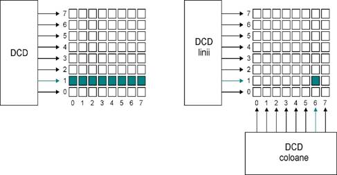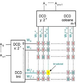 Selectia unui cuvant din memorie se poate face liniar, utilizand un singur decodificator sau prin coincidenta, utilizand doua decodificatoare - unul pentru linii si altul pentru coloane (figura 2). Selectia prin coincidenta este singura utilizata la memoriile de capacitate mare. De exemplu in cazul unei memorii avant o capacitate de 1 Mcuvant, sunt necesare 20 de linii de adresa, iar utilizarea unui singur DCD ar presupune ca acesta sa aiba 1.048.576 linii de iesire, pe cand utilizarea a doua DCD, fiecare cu 10 intrari, reduce numarul de linii de iesire pentru fiecare DCD la 1024. In figura 2 matricea de memorare este presupusa bidirectionala, la selectia prin coincidenta cuvantul avand o latime de 1 bit. In cazul des intalnit in practica de cuvinte pe 4, 8 sau 16 biti modelul matricii de memorare bidirectional nu mai satisface si se utilizeaza un model tridimensional (figura 2).