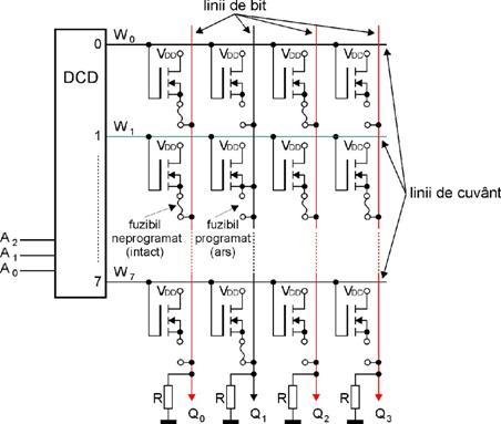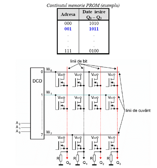 Utilizatorul foloseste un dispozitiv special numit programator prin intermediul caruia poate inscrie informatia dorita intr-o astfel de memorie. Dupa programare, doar in anumite cazuri se mai pot face modificari respectiv programa circuitul. In stare neprogramata, fuzibilele sunt intacte, iesirea fiind pe 1 logic. Programarea se bazeaza pe intreruperea unei conexiuni existente in memoriile neprogramate. Intreruperea se face prin vaporizarea unor trasee prin impulsuri de curent generate in mod corespunzator de echipamentul de programare. Iesirea unui bit programat este pe 0 logic. Memoria PROM din figura 6 are o capacitate de 8 cuvinte a 4 biti, adica de 32 de biti. Pentru a memora la adresa 1 (A A A = 001) cuvantul 1011, in timpul programarii se va "arde" doar cel de-al doilea fuzibil corespunzator liniei W . Dupa programare, la selectia liniei de cuvant W la iesire se va regasi informatia dorita, adica 1011. Trebuie remarcat ca un bit neprogramat poate fi ulterior trecut in 0 la o noua programare, dar un bit programat nu va putea fi readus in 1 logic, cu alte cuvinte la adresa 1 cuvantul 1011 va putea fi reprogramat in 0011, dar nu in 0111.